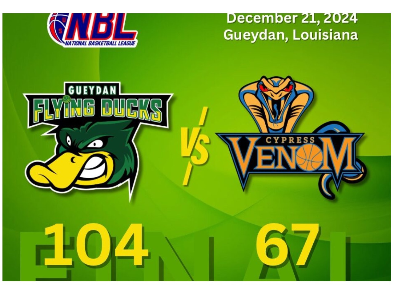 The Gueydan Flying Ducks dominated the game against the Cypress Venom with a decisive 104-68 victory. Their commanding performance was highlighted by superior shooting, rebounding, and defense. Gueydan’s offense was on full display, making 43 of 92 field goals (46.7%) and hitting 12 of 39 from beyond the arc. Meanwhile, Cypress struggled with their shooting efficiency, converting only 27 of 103 attempts (26.2%) and making 7 of 38 three-point attempts.